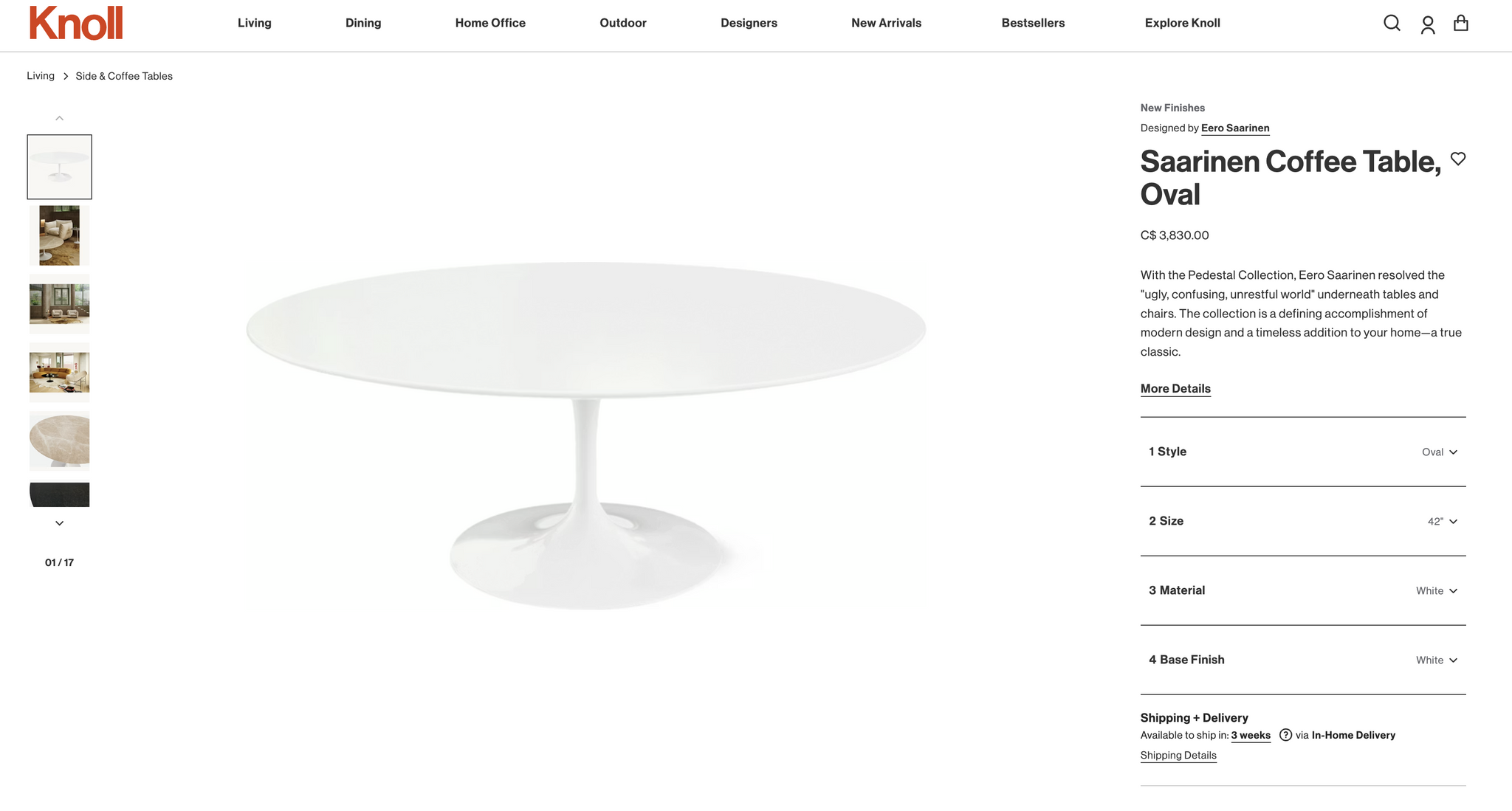 Current Knoll Canada retail for the Saarinen Oval Coffee Table is approximately $3,830 CAD (see screenshot).
