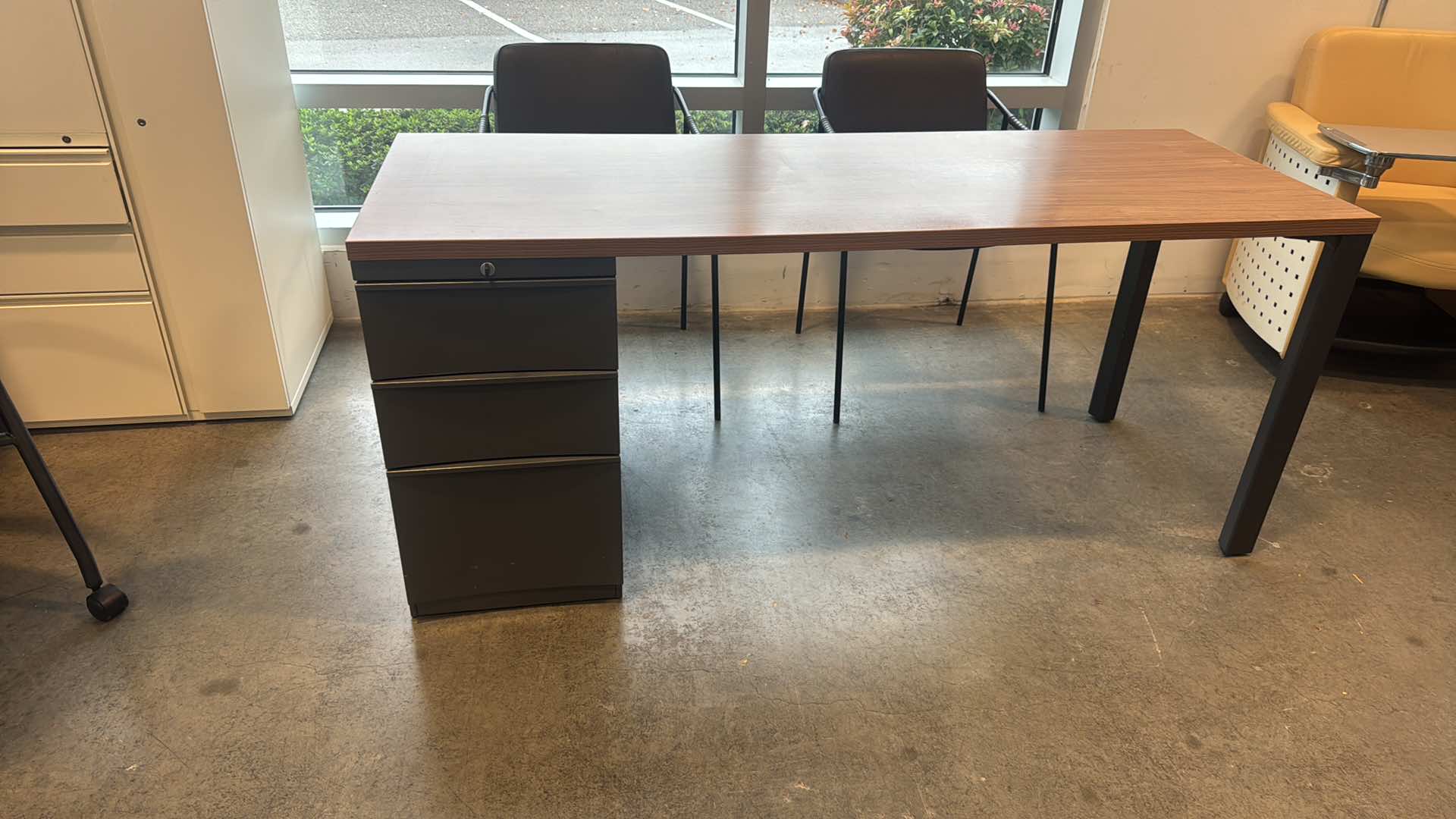 Sleek, professional, and built for productivity. This Herman Miller workstation features a spacious 66” x 24 ” surface in a mahogany finish paired with a durable charcoal steel frame and an integrated 3-drawer locking pedestal for secure storage.