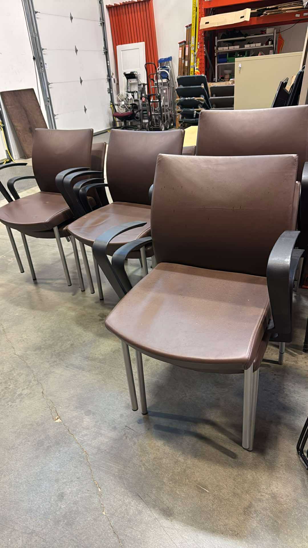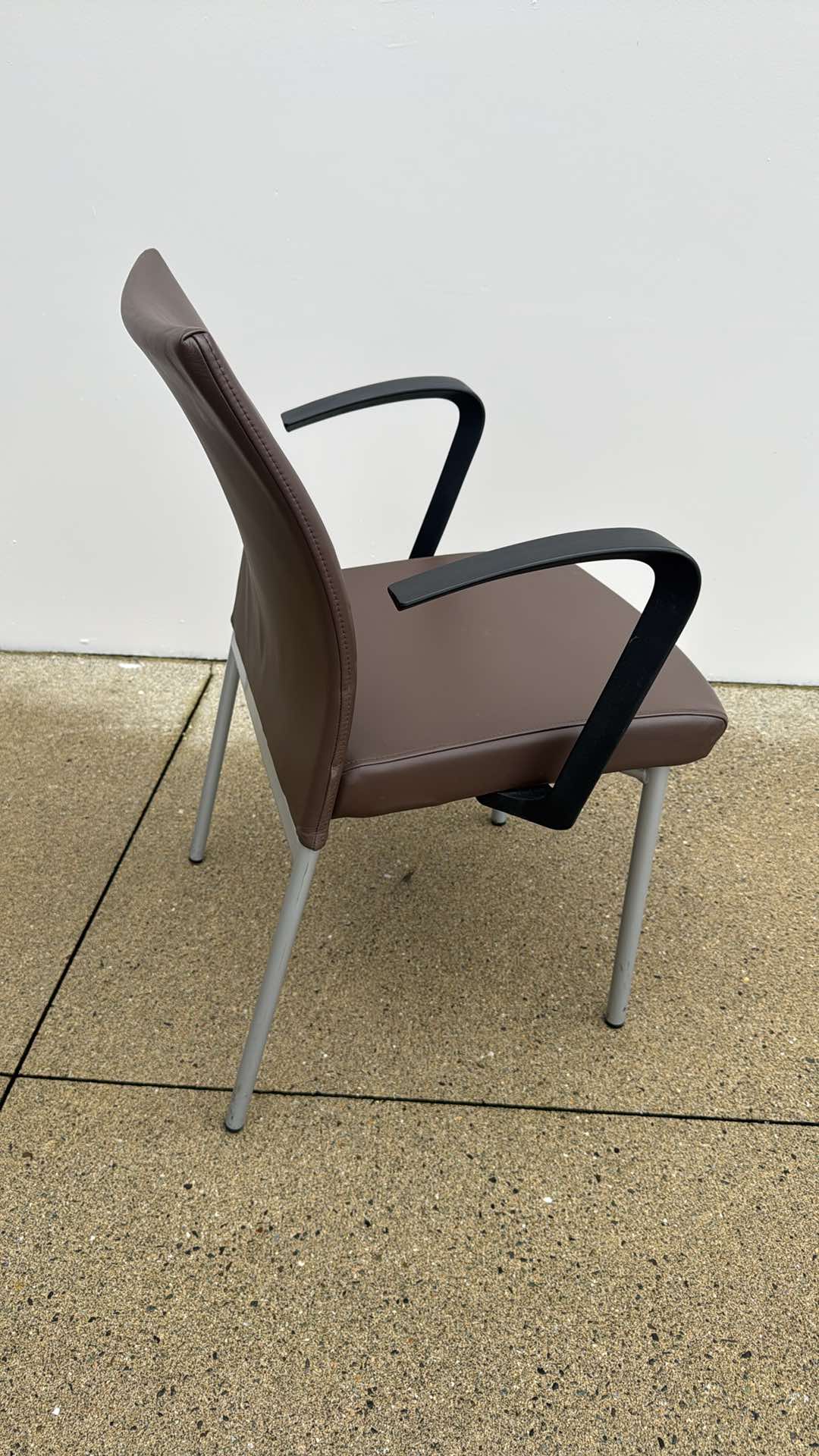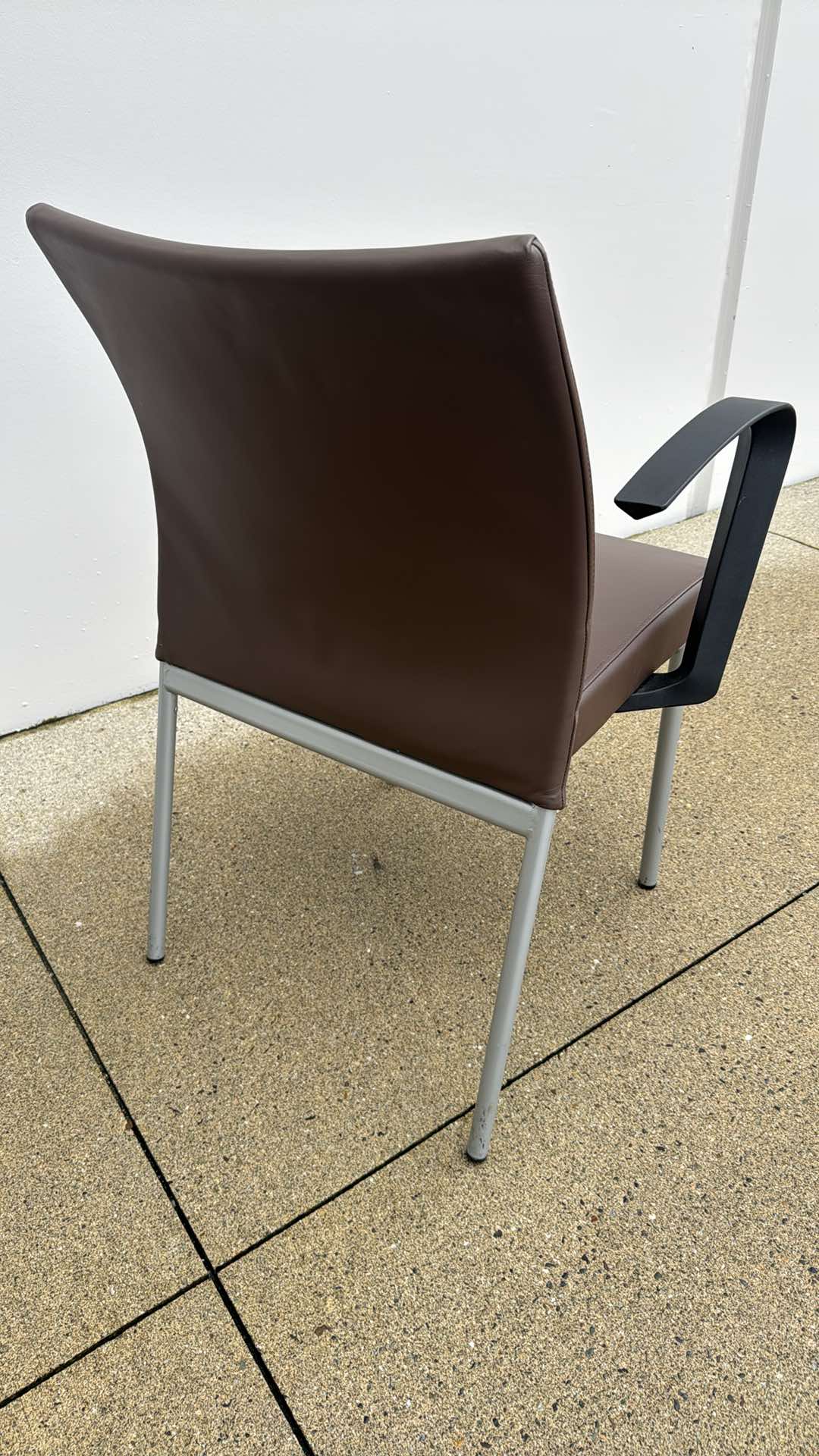 These Krug Dauphin guest chairs offer a clean, modern design with commercial-grade durability. Upholstered in brown leather with a sculpted, ergonomic back, they deliver excellent comfort for reception areas, meeting rooms, and client seating.