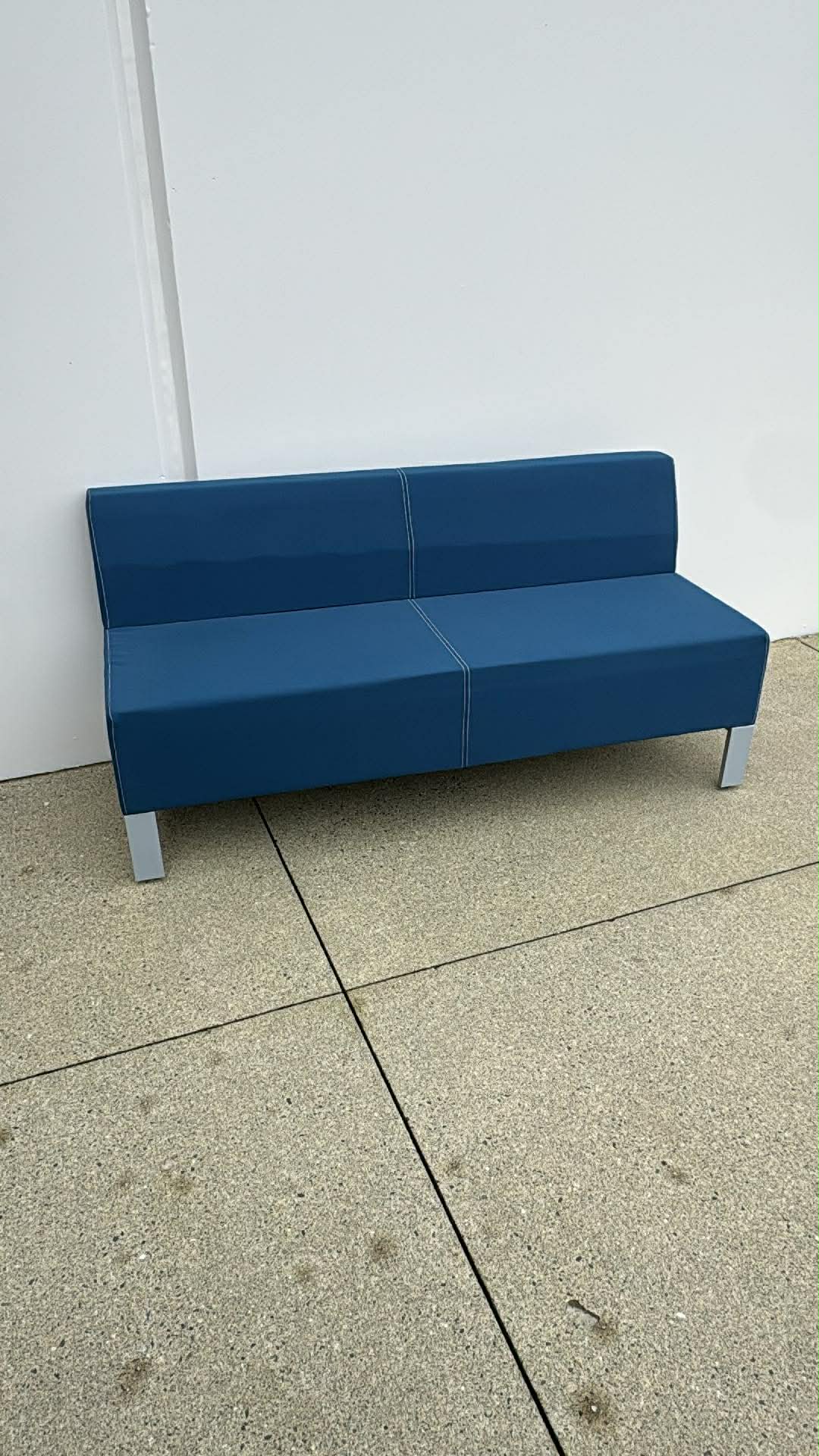 Upholstered in durable blue commercial-grade fabric with clean stitching and a full backrest, it offers a sleek, minimalist look while remaining comfortable and functional. The modular design allows it to be used as a standalone bench or combined with other Bridges components.