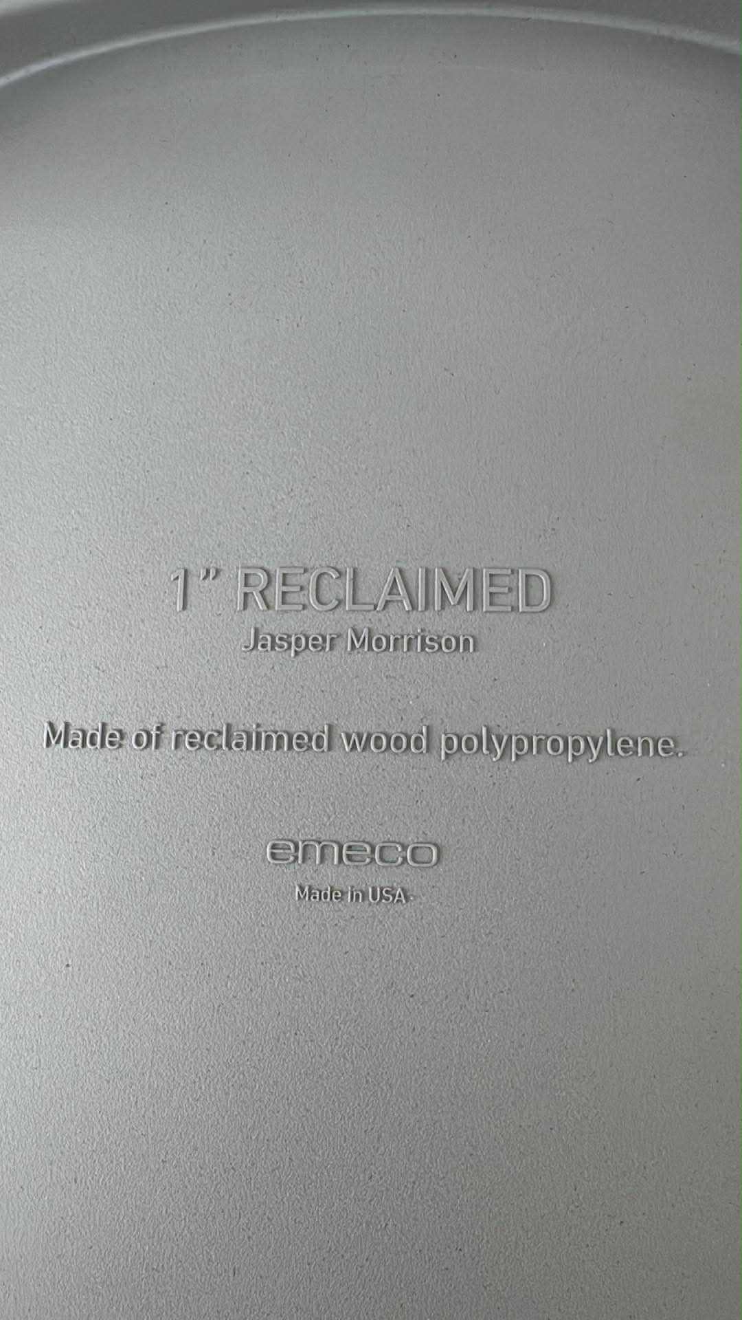 Authentic Emeco 1” Reclaimed chair designed by Jasper Morrison. Made in the USA from reclaimed wood polypropylene, this chair is extremely durable, lightweight, and environmentally responsible. Designed for high-traffic commercial use but clean enough for residential or café settings.