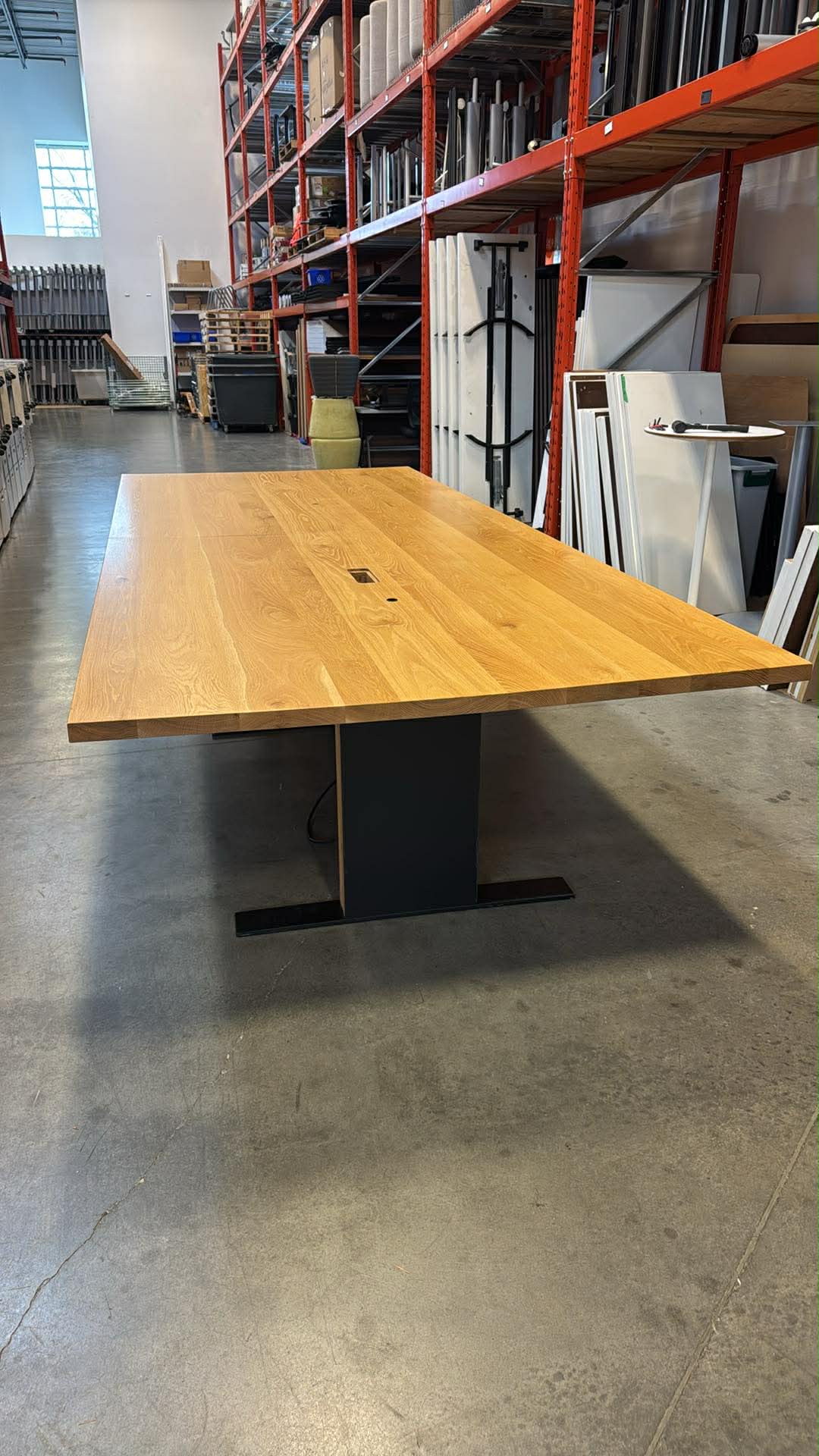 Large, modern 12-foot boardroom table featuring a thick solid wood top and integrated power—ideal for conference rooms, executive meeting spaces, and collaborative offices.