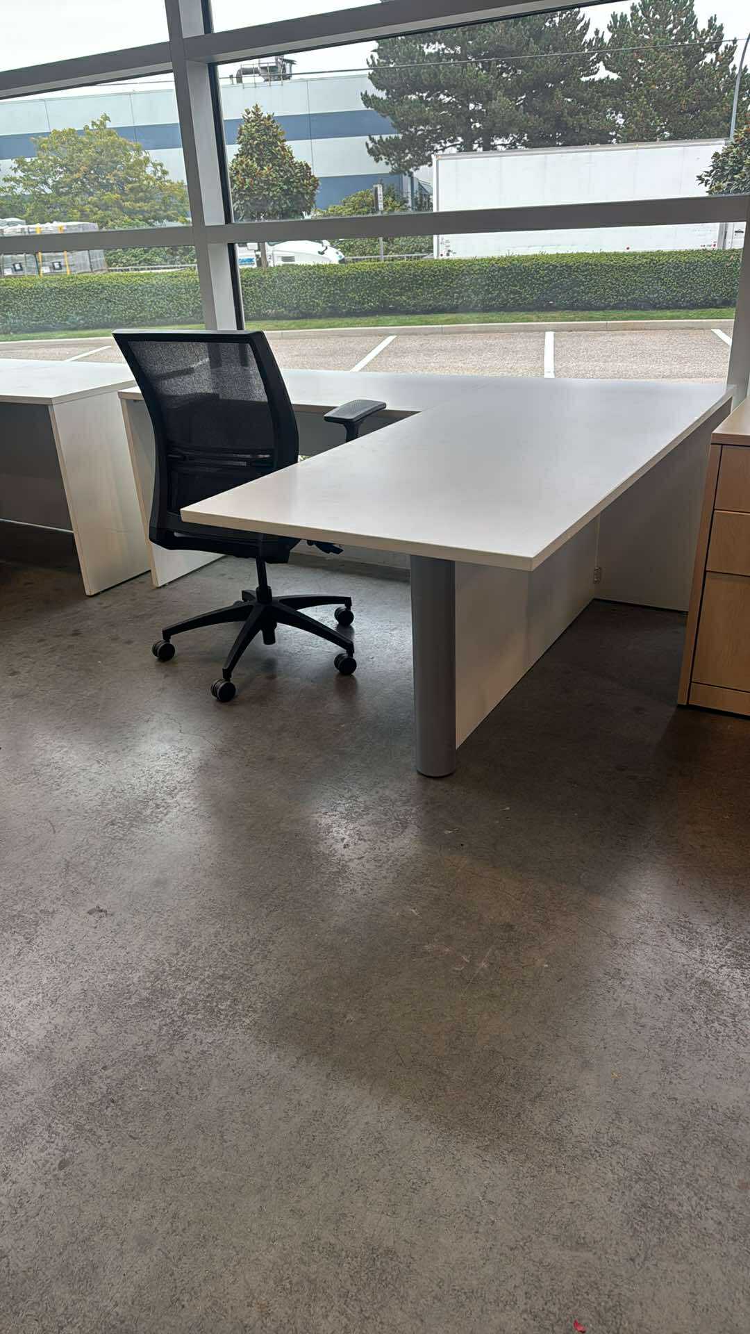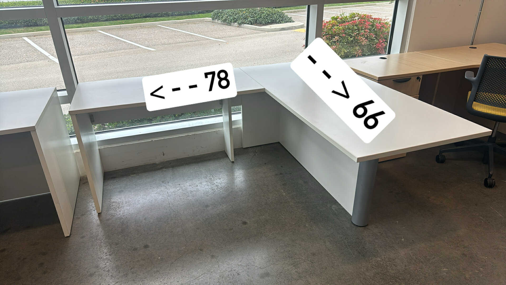 Modern white L-Shape desk, brand name David Lane. Easy to transport, comes apart in 2 pieces.
