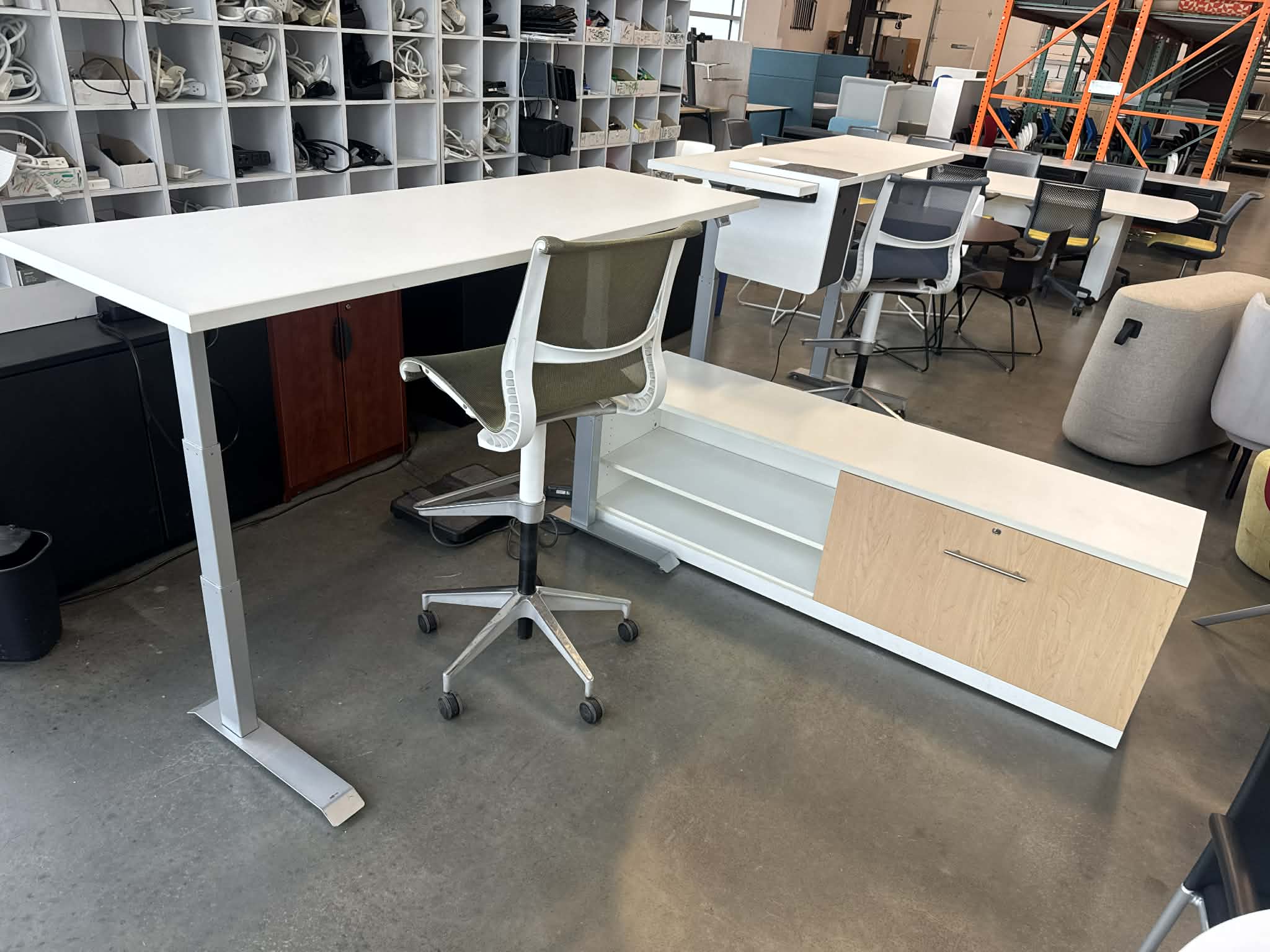 The Workrite sit-stand desk provides smooth electric height adjustment, allowing easy transitions between sitting and standing throughout the day. Paired with the matching David Lane credenza, this setup offers ample surface space and integrated storage without sacrificing a modern, minimalist look.