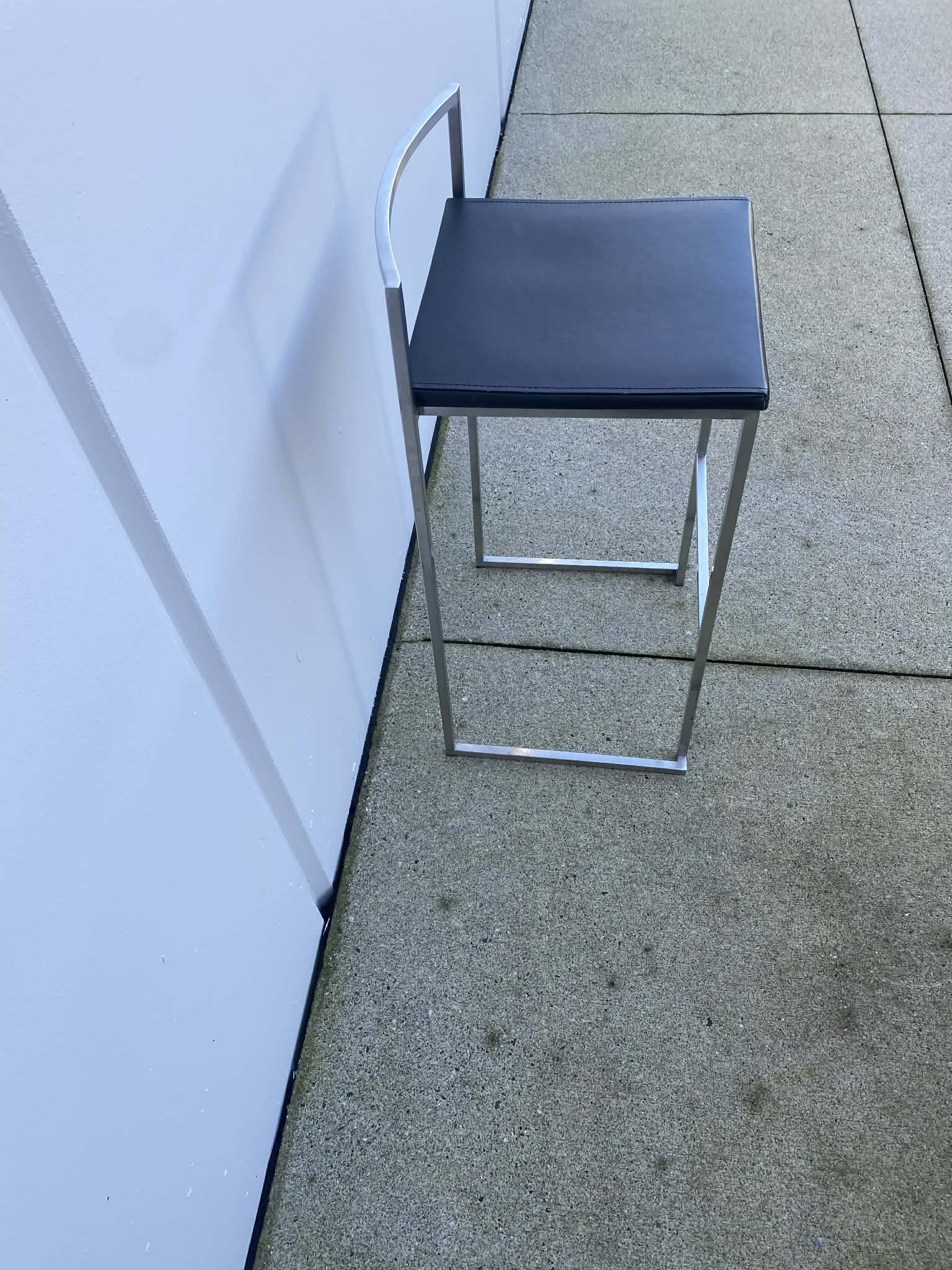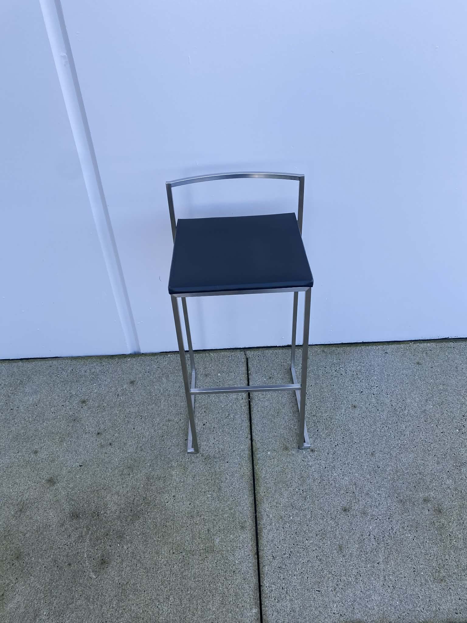 Sleek and modern bar stool featuring a black upholstered seat paired with a brushed stainless steel frame. Clean lines and a compact footprint make this a great fit for kitchen islands, bar-height tables, break rooms, or commercial spaces.