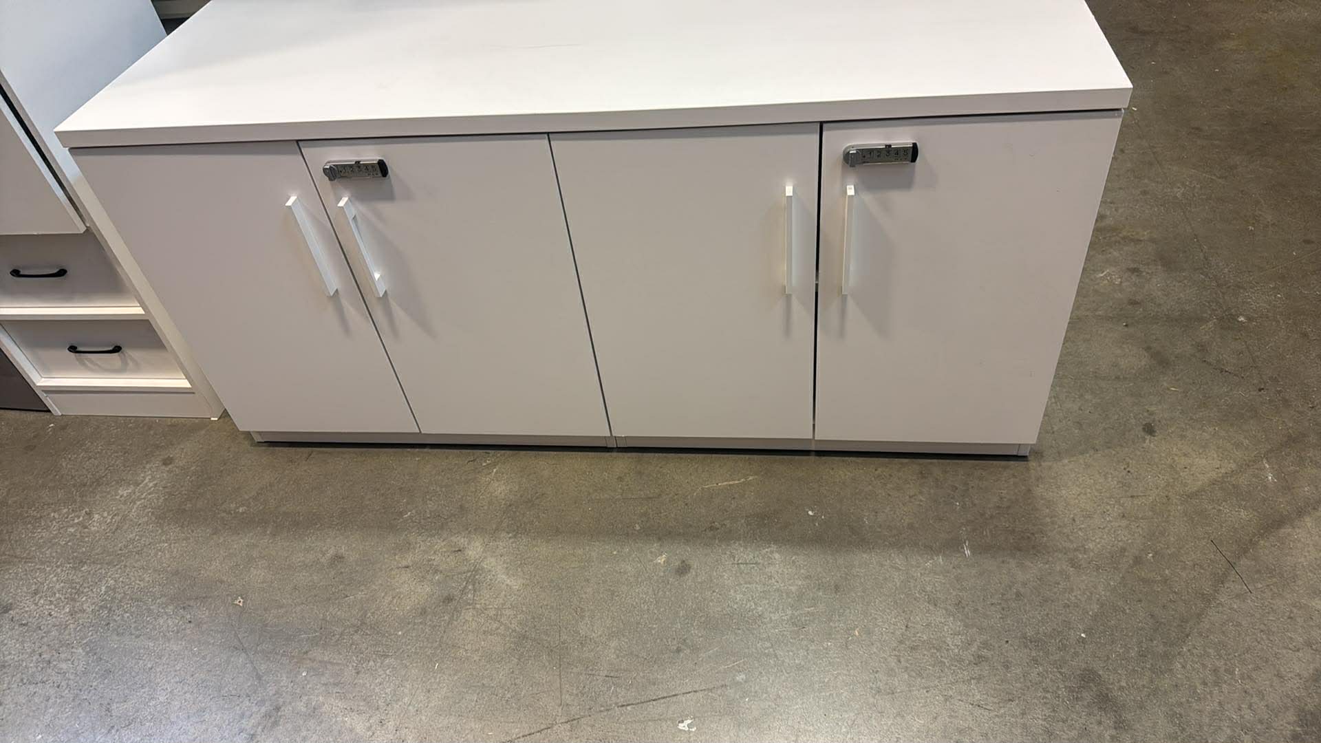 High-quality dual storage cabinet in a clean white finish, featuring electronic keypad locks for secure access. This is a commercial-grade cabinet designed for professional office, medical, or institutional environments.