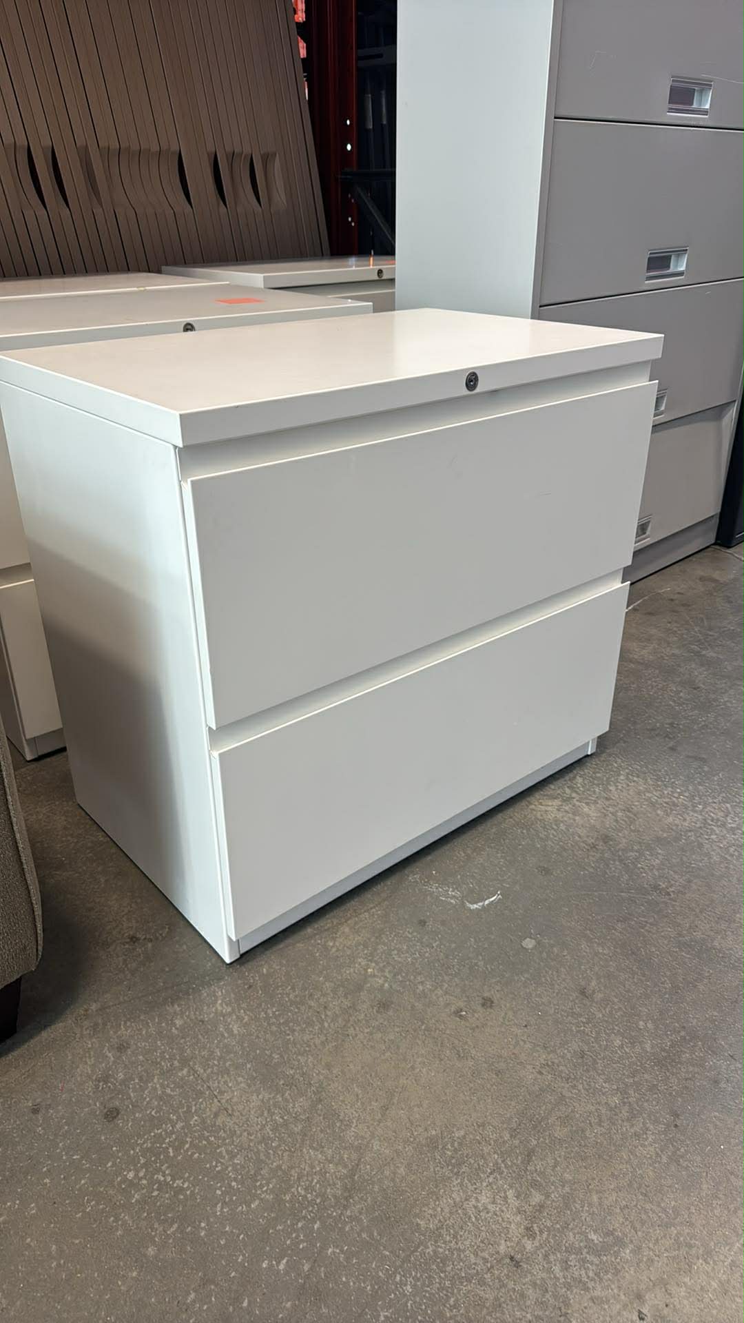 High-quality Haworth lateral filing cabinet in a clean white finish. Designed for durability and smooth everyday use, this cabinet is ideal for offices, home workspaces, or professional environments where secure storage is needed.
