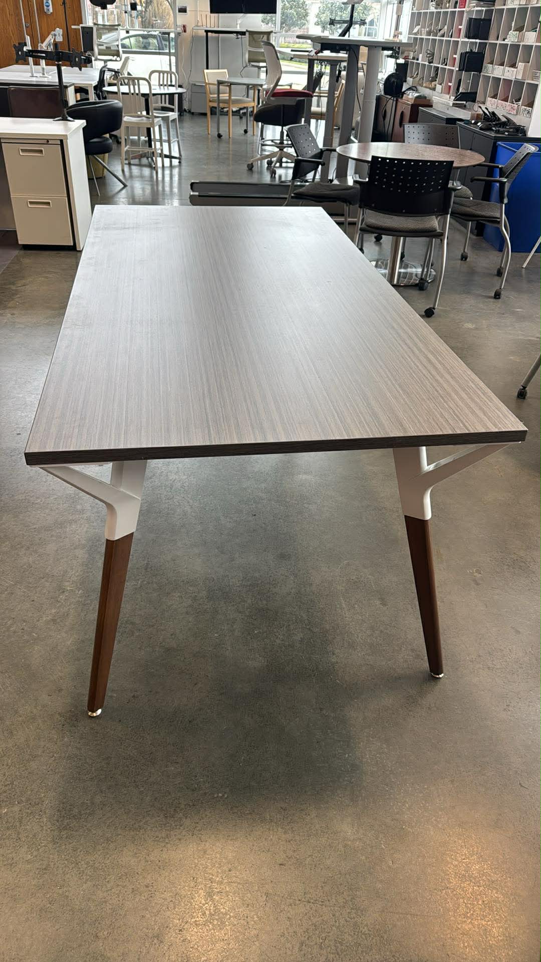 Authentic Herman Miller OE1 table featuring a modern woodgrain laminate top and iconic angled OE1 legs with solid wood accents. Designed for flexible workspaces, collaboration areas, boardrooms, and modern offices.